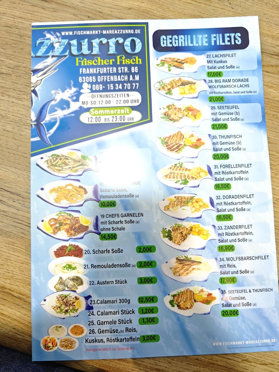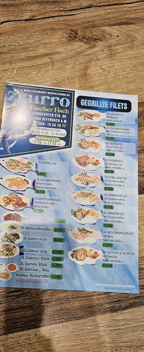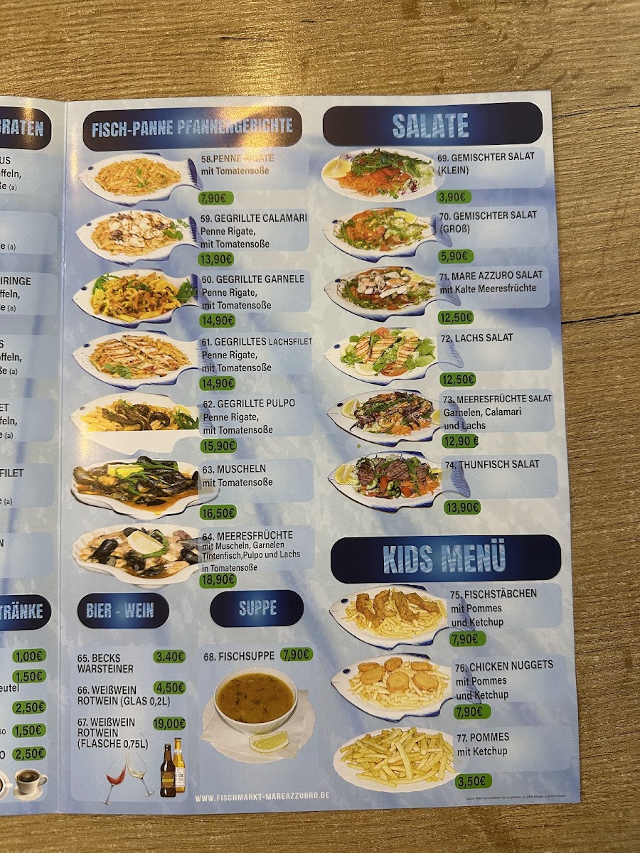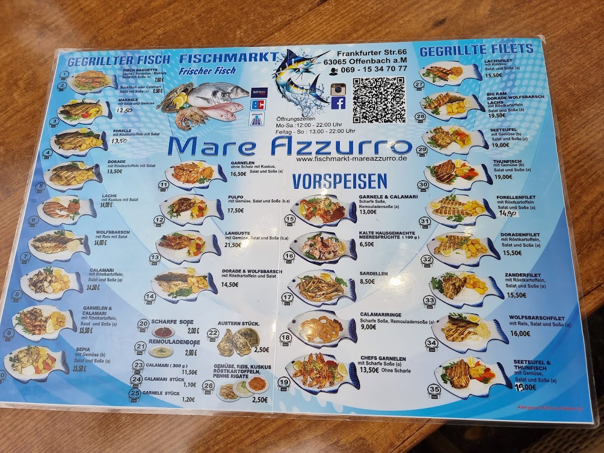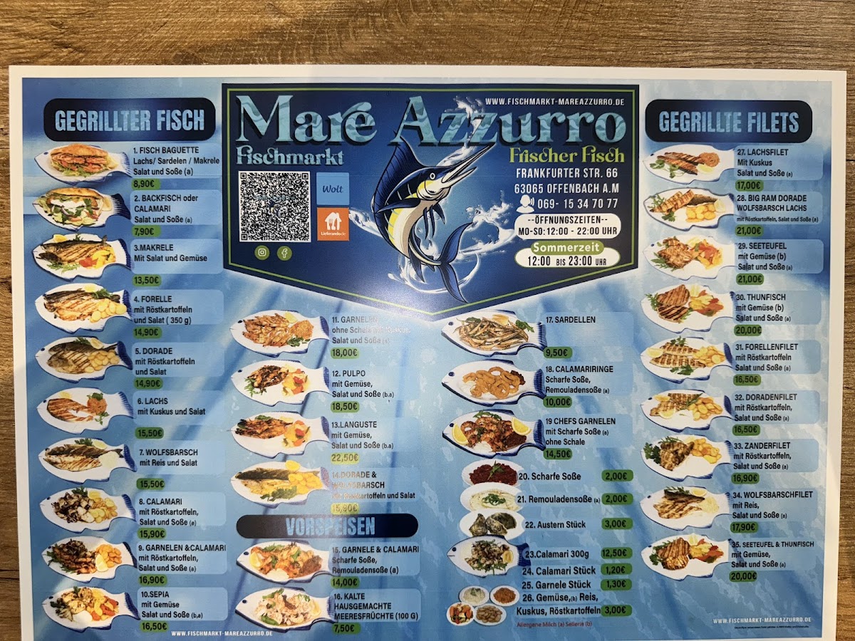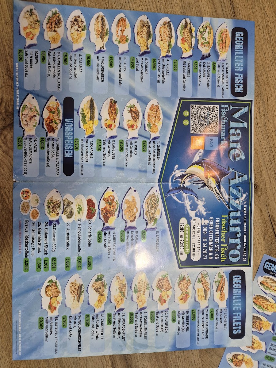 If you're looking to enjoy some of the freshest seafood in Offenbach am Main, the Fischmarkt Mare Azzurro - Offenbach Am Main Menu is the place to be. Located at Frankfurter Str. 66, this cozy spot is all about bringing the ocean's best flavors straight to your table. The menu offers a variety of mouthwatering dishes, from perfectly grilled fish to flavorful seafood pastas that are hard to resist. Whether you're in the mood for something light or a hearty meal, there's always something satisfying on offer.
